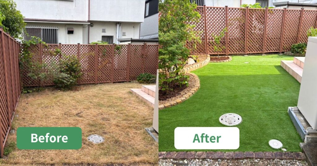 新築の更地だった裏庭に、子どもたちが遊べてご家族が過ごせる空間を作るため人工芝を施工しました。天然芝では管理が大変とのことで、安全で手間のかからない人工芝を採用し、快適で使いやすい庭に仕上げました。